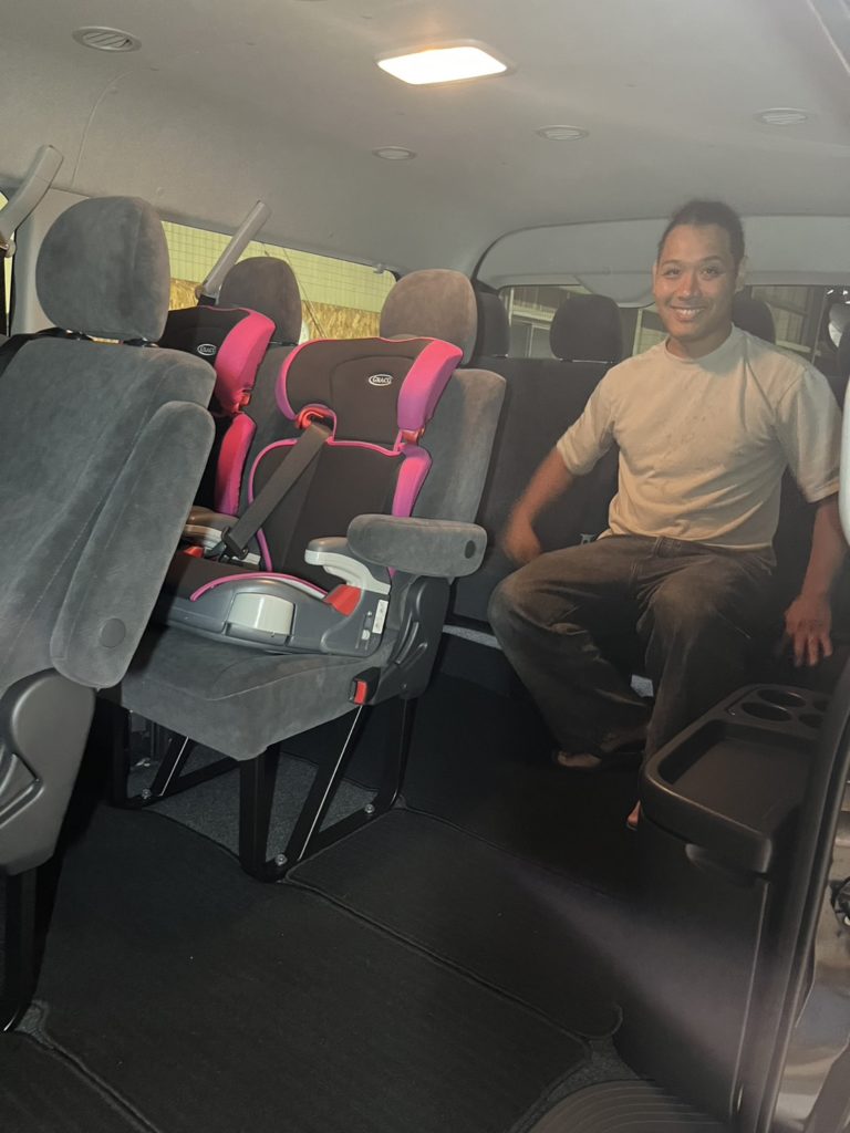 このようにチャイルドシートを三人分乗せても広い車内は、ファミリーカーとしても、アウトドア車としても大活躍👍‼お子様が成長しても長く使える一台です😊