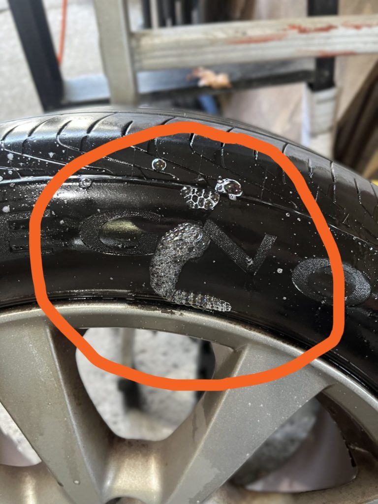 タイヤの側面に穴が開き、エア漏れを起こしている状態でした。